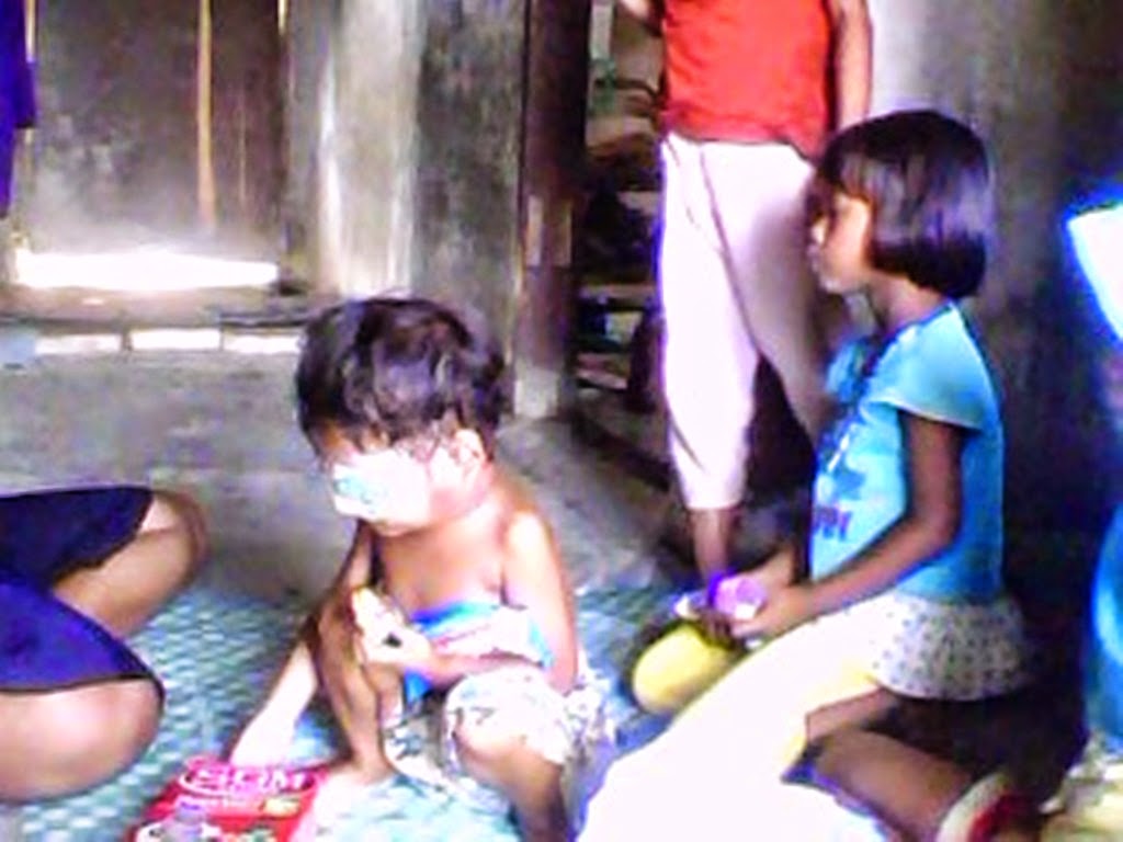 Sesampai di rumah keluarga Bapak Siteh dan Ibu Syamsiah saya melihat sekilas kondisi rumah yang mereka tempati sekarang,kondisinya tidak jauh berbeda dengan rumah yang lama sangat sederhana,Kecil (maaf) agak kumuh kurang terawat dan jauh dari di ruang tengah saya lihat Sinta lagi makan bersama kakaknya dan yang dimakan hanya nasi putih tanpa lauk.......,terlihat kondisi tubuh Sinta tidak seperti beberapa bulan yang lalu jika dulu badannya agak berisi (gemuk) dan sorot matanya ceria dan aktif kesana kemari layaknya anak kecil,tetapi sekarang badannya kurus kurang gairah dan mudah menangis,di tambah lagi benjolan di mata kirinya semakin membesar dan pada bagian pipi,leher hingga ke tengkuk kiri bengkak di tambah ada benjolan baru di sekitar pipi hingga ke mendekati telinga kiri.Dengan Sendok ditangan Sinta begitu lahap menyantap nasi putih di piring plastik berwarna biru hingga habis,kepadanya saya serahkan titipan seorang teman (hamba Allah) yang menyerahkan menitipkan sejumlah uang untuk Sinta kepada saya dan saya pikir sejumlah uang tersebut saat ini lebih baik saya belikan susu formula dan roti untuk Sinta dan semua itu saya beli di kota Tanjung pura sebelum saya menuju kerumah Sinta,ketika menerima kantongan plastik yang berisi susu formula,roti dan lain lain,tampak begitu senangnya Sinta tampak perubahan pada sorot matanya memandang langsung ke mata saya seakan akan ingin mengatakan dan mengungkap perasaan hatinya (tak terasa mataku berair dan kucoba menahan air mata tsb didepan Sinta).