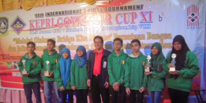 Atlet pelajar Langkat menerima piala kejuaraan di 11th Kepri Governor International Bridge tournament 2014 PLN Batam Cup 8 Student Bridge Championship 2014 |